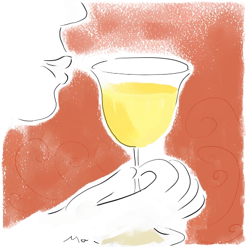 Jemand, eine Frau, führt ein tulpenförmiges Glas Wein zum Mund. Es ist bis zu seinem Rand gefüllt.