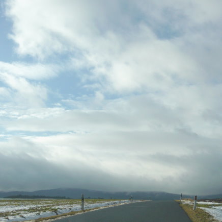 Die Straße gleicht flüssigem Gold, windet sich, eine leuchtende glitzernde Schlange die Anhöhe hinauf, links gesäumt von einer endlosen Reihe knorriger blattloser Zwetschgenbäume, der Himmel ein luftiger Spiegel, teils mit schweren pudergrauen Schneewolken verhangen, teils klar voller Sonnenstrahlen und eisig blau.