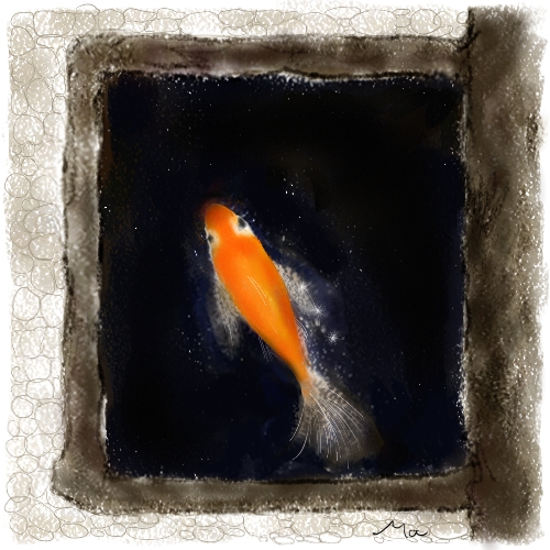 In dem klaren und unergründlich tiefen Wasser eines Dorfbrunnens schwimmt still ein einzelner Goldfisch