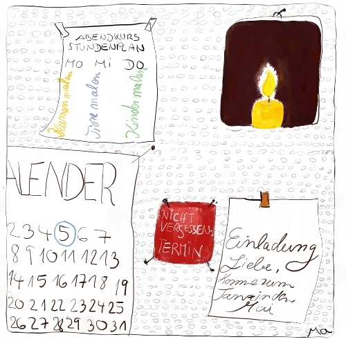 In der Mitte des kleinen Tisches wuchsein Baum, ein Bonsai, aus einer flachen Schale. Umrahmt von vier Vögeln. Mir ist das erst zwei Tage später aufgefallen, obwohl ich die ganze Zeit hingesehen habe.