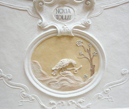 Detail der Stuckdecke der kleinen Kapelle: Sequenzen des Guten Hirten, in der Mitte der Pelikan, der seine drei Jungen nährt.