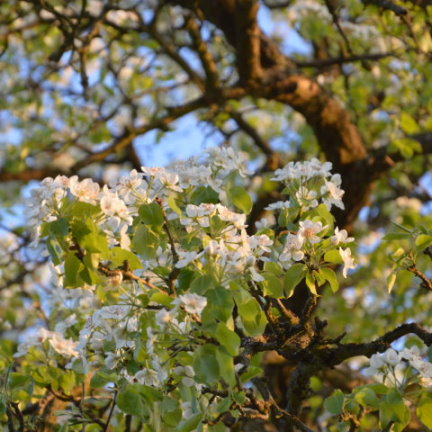 Ein uralter prächtiger Birnbaum am Waldrand zeigt sich in strahlendem Weiß.
