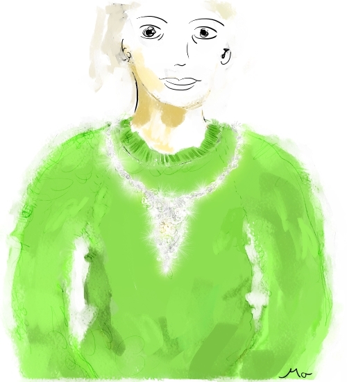 Sie trägt flauschig hellgrünes Mohair. Und ein silberhell leuchtendes Collier über ihrer Brust.