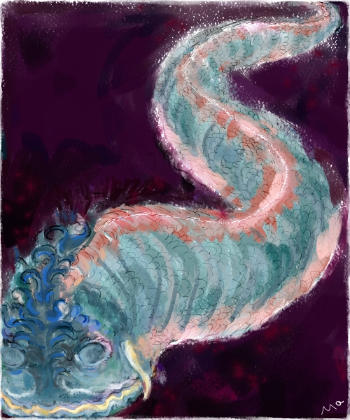 Riesiges Schlangenwesen im leeren, dunklen Raum in mir. Das fühlt sich ganz seltsam an. Es ist riesig, wie es so langsam dahingleitet, schwebt.