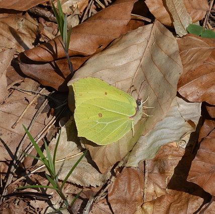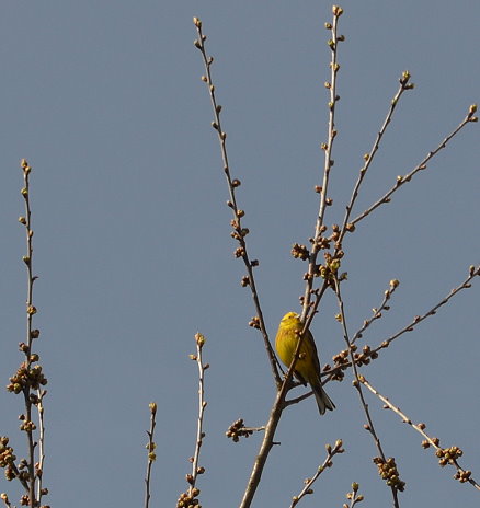 Ich sah einen kleinen Vogel, der pflückte mit seinem Schnabel eine gelbe Blüte am Wegrand und flog damit fort.