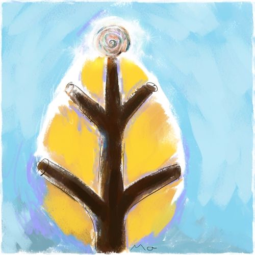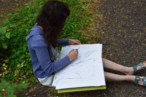 Plötzlich flog etwas vom Baum herab und landete mit einem Peng mitten auf dem Zeichenpapier. Genau bei der sich schnell bewegenden Tuschefeder, die gerade mehrere explodierende Blattsterne produzierte, und landete von dort in einem hohen Bogen im Gras neben der Zeichnung.