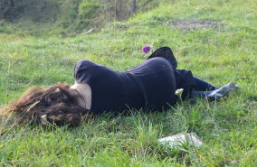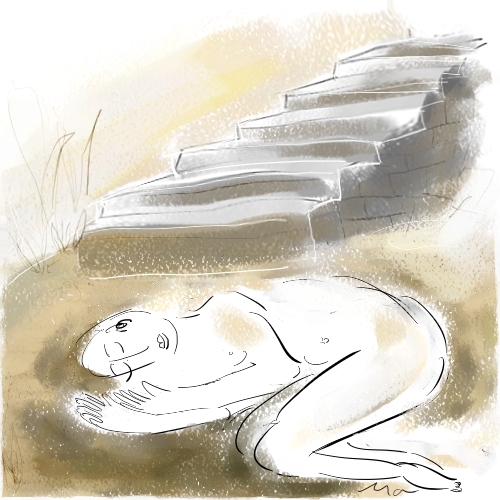 Am Fuße einer kleinen Treppe liegt sie zusammengerollt wie ein Kind.