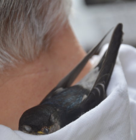 Am Morgen im Büro: Wenige Minuten vor dem ersten großen Flug ohne Wiederkehr, ein seliges Nickerchen an ihrem absoluten Lieblingsplatz, dem wohligwarmen Nacken meiner Mutter, welchen sie auch gegen meinen riesigen federlosen Finger furchtlos zu verteidigen wußte. Meine Mutter arbeitete währenddessen ungeührt weiter. Die kleine Schwalbe ließ sich auch nicht von eingehenden Telefongesprächen stören.