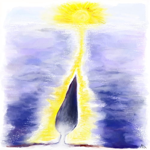 Eine Zypresse vor dem weiten Meer. Über dem Meer, dem Horizont, genau über der Zypresse, genau in der Mitte des Bildes, steht die Sonne. Das Licht der Sonne reflektiert auf dem Meer, es fließt auf dem Wasser vom Ende des Horizonts zu der Zypresse hin und umhüllt sie.