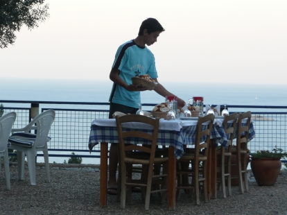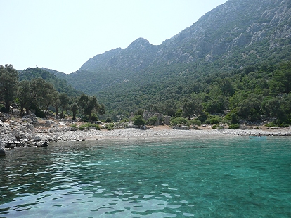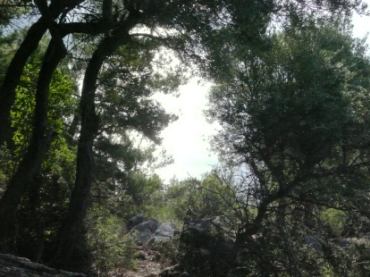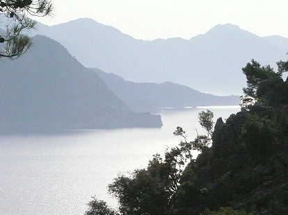 Vor dem Frühstück unternahmen wir einen Spaziergang auf die andere Seite des Bergkamms, an welchen sich die Akademie schmiegte. Meine Begleiterin hatte schon einige Tage vorher den Pfad entdeckt und mich gefragt, ob ich sie nicht einmal begleiten wolle. Nachdem wir schon eine Weile hintereinander her gegangen waren, sah ich plötzlich von weitem einen Mann in dem steil abfallenden und nach wilden Kräutern duftenden Pinienwald einsam und still auf einem Stein oder einem Baumstumpf sitzen, der stumm in unsere Richtung sah. Wir gingen weiter. Kletterten über den felsigen Bergkamm, der auf der anderen Seite ebenfalls unerwartet steil ins Meer abfiel. Wir bogen nach links ab und stiegen über Wurzeln und Steine noch höher hinauf. Der Abhang war teilweise mit bereits vertrocknetem Gras bedeckt, das oft vom Licht irisierender hauchzarter Blüten durchbrochen war. Der Blick, der sich uns oben angelangt schließlich nach Osten hin auf die Weite des Meeres und auf die Insel bot, welche sich inmitten des Zugangs zur großen Bucht aus dem Wasser weit unter uns erhob, war atemberaubend und entschädigte mehr als genug für das frühe Aufstehen und den mühsamen Aufstieg. Er war so schön, daß wir lange innehielten. Die Morgensonne zauberte einen noch jungfräulichen Schimmer über die schroffen Berghänge mit ihrem dunkelgrünen Pflanzenbewuchs, obwohl ihre Strahlen bereits sehr warm und stark waren. Es war, als hätten wir plötzlich Eintritt in eine andere, in eine noch ganz unberührte Welt gefunden. Die üppige und wilde Natur dieses Landstriches schien uns glühend heiß und kühl zugleich zu umarmen. Anzuhauchen. Mit uns zu atmen. Bot sich unseren staunenden Augen, unseren Sinnen dar. Das Meer glitzerte. Jedes gesprochene Wort schien zuviel.