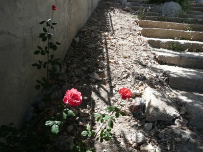 Treppe zum Meer und eine rote Rose, welche aus den Steinen gewachsen ist