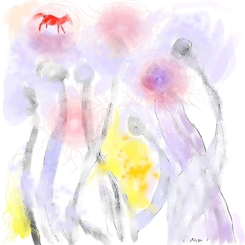 Ich träumte, daß eine zarte Pflanze aus der dunklen Erde im Blumentrog gesprießt ist. Sie hat zwei hauchdünne Halme wie junges Gras. Aber unter der Erde hat sie eine riesige Zwiebelknolle, die da verborgen ist, es ist eine wirklich riesige Knolle im Verhältnis zu den dünnen Hälmchen, die getrieben sind. Dann krabbelten rote Ameisen auf meinem linken Ärmel. Ich trug ein dünnes, weißes, leicht durchscheinendes Baumwollgewandt mit einem etwas kürzen Ärmel - er reichte bis zu den Ellbogen - über einem längeren bis zum Handgelenk. Die Ameisen krabbelten genau in der Beuge. ... Ich bin in einer kleinen Felsenhöhle. Drei Strohpuppen oder Heupuppen stehen vor dem Eingang. Ein Feuer kommt und die drei Puppen brennen lichterloh. Dann bläst das Feuer genau in die kleine Höhle hinein, dorthin, wo ich bin.