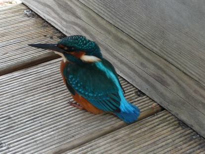 “Komm einmal, schnell”, hat mein Vater zu mir gesagt. Ich saß gerade am Schreibtisch im Büro und war mit Konten beschäftigt. Folgte ihm. Folgte ihm über dem Hof zum Ausstellungsraum. Und da sah ich, was er meinte, warum ich schnell kommen sollte, es war nicht wegen eines Autos, sondern da saß ein kleiner Eisvogel auf dem Gehsteig, der offensichtlich im Pfeilflug stockvoll gegen das Fenster geprallt war. Er bewegte seinen Kopf seltsam ruckartig und war sichtlich benommen. Das war so ein schlimmer Anblick. Schnell ging ich hin, nahm ihn in meine Hände und hob ihn auf. Ich habe ihm dann einen dunklen, katzensicheren Platz auf der Dachterrasse eingerichtet. Es sieht nicht gut aus. Das größte Problem neben der Verletzung - er kann auch nicht mehr fliegen - ist das Füttern.