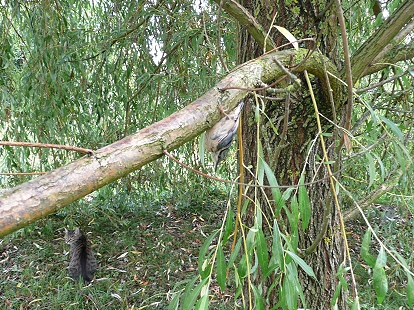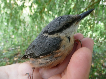 Wieder ein Patient... ein kleiner Kleiber. Die drei Kinder haben an der Haustüre geklingelt und mich zu ihm geführt. Er ist, glaube ich, auch gegen die Scheibe geflogen. Er kann nicht gut fliegen und sein linkes Auge hält er immer geschlossen. Ich wünschte, ich könnte etwas tun. Vor allem bei den kleinen Vögeln ist das so schwierig. Ich habe ihn jetzt nicht auf dem Dachgarten behalten, denn er ist so aktiv - ich hätte ihn im Käfig lassen müssen, was ihm gar nicht gefiel. Deshalb setzte ich ihn auf einen Ast der Weide, von dem aus er nach einer Weile gekonnt höher sprang und flog. Kleiber sind ausgezeichnete Kletterer und lieben Parks und Bäume. Hoffentlich hat er ein wenig Glück und die Katze sieht ihn nie.