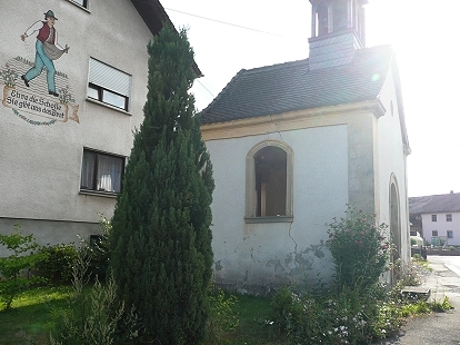 Das Kirchlein ist ganz leer geräumt. Es hängt nur noch ein schwarzes Kreuz mit einer silbernen Jesus-Figur an der linken Wand. Es ist schade, daß es abgerissen wird.