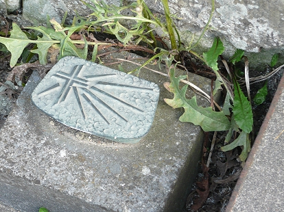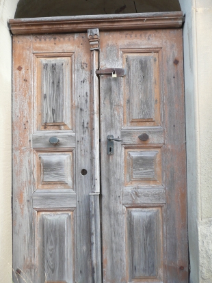 Links neben den Treppenstufen hoch zur schlichten aber schönen Eingangstüre mit Guckloch das Gefäß für das Weihwasser.