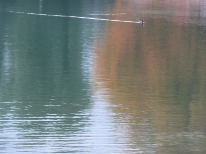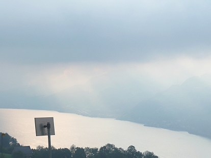 Die hohen Berggipfel um den See lagen noch in Wolken gehüllt, doch langsam klarte es auf und die Felswände begannen durch die Wolken hindurch zu leuchten. Ich hielt noch einmal, ging zum Ufer des Sees. Fotografierte. Fotografierte den glitzernden Spiegel, das Licht darin. Die Farben der Bäume am Ufer. Jetzt war es nicht mehr weit. Nur noch wenige Kilometer. Langsam fuhr ich den Berg hinauf und versuchte dabei die Straßennamen zu lesen. Oben angekommen fragte ich schließlich die Frau in der Poststelle, die mir freundlich Auskunft gab. Jetzt fuhr ich wieder den Berg hinunter. An einem Kreuz hing ein Jesus mit einem goldenen Lieb, der in der Morgensonne hell strahlte. Ich fand die Straße, an der ich vorhin vorbeigefahren war. Fuhr aber noch einmal ganz nach unten, da ich immer noch zu früh war. Hielt wieder. Fuhr wieder hinauf. Bog ab.