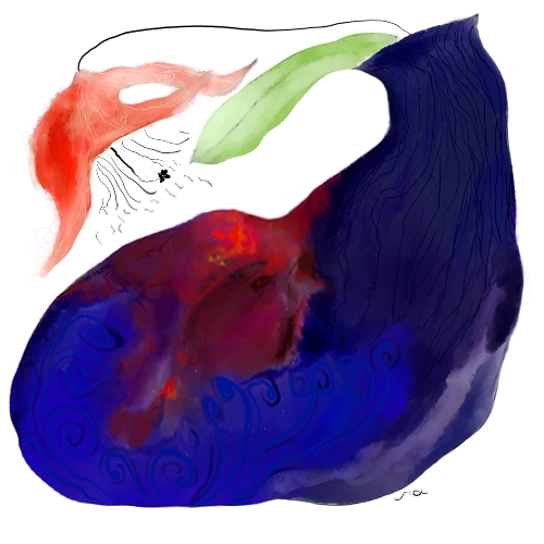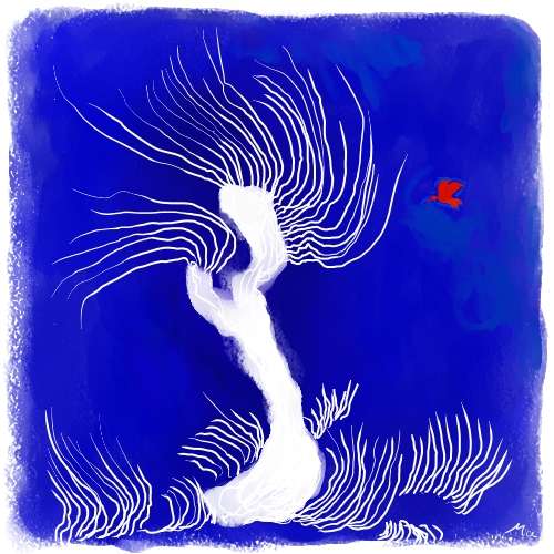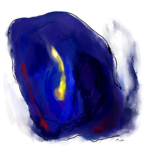 Deshalb die blauen Hände, welche sie vor ihr Gesicht geschlagen hat. Die blauen Hände sind wie weiches Wasser. Flutend. Lindernd. Sie schwemmen das Harte fort, tragen es zurück in die Erde, die es gütig aufnimmt. Zu reinigen vermag.