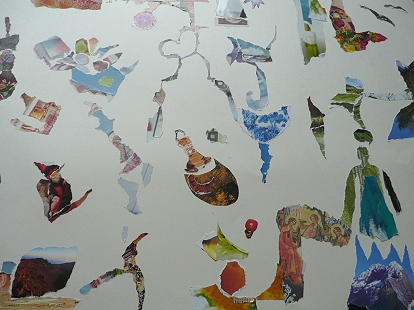 Eine aufgeschlagene Doppelseite mit vielen kleinen bunten Schnipseln.