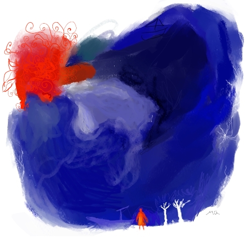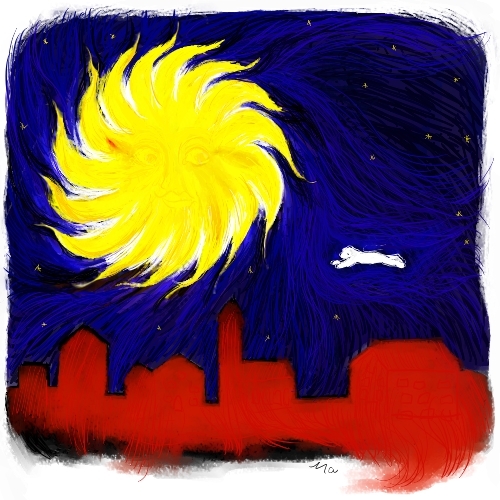 Ich hatte einen Traum, in dem neben den beiden Katzen noch ein drittes Tier bei mir Zuhause lebte. Es steht gerade auf meinem Sofa, während die beiden anderen Katzen irgendwo in einiger Entfernung auf dem Boden sitzen. Es sieht ein wenig ungewöhnlich aus. Es hat ein wuscheliges, orangeschwarz getigertes Fell, ist vielleicht so groß wie die kleine Katze und gleicht von seinem Aussehen eigentlich auch ein wenig einer Katze. Bis auf sein tigerhaftes Fell. Sein Rumpf hat eine längliche Tonnenform. Aus seinem Gesicht blicken zwei grünschwarze Kugelkulleraugen groß in die Welt hinaus und mitten auf seinem Kopf, vorne auf der Stirne, da hat es einen seltsamen, dünnen Fortsatz, der da herausgewachsen war. Dieser Fortsatz ist nicht mit Fell bedeckt und sehr beweglich. Er ist so etwas wie eine lange, hochempfindliche Antenne, ein Fühler. Oben, an seinem Ende, hat dieser biegsame Fühler eine Verdickung. Vielleicht sitzt dort ein Sensor. Oder es ist so, wie bei einem Leuchtkäfer. Und dieses kleine Tier verfärbte sich auf einmal, ohne das ich einen Grund dafür erkennen konnte, mit seinem ganzen Körper apfelrot. Sein Fell war auf einmal verschwunden, es stand sozusagen nackt da, und seine nun sichtbare und sehr glatte Haut glühte apfelrot! Errötet tief und vollkommen. (Aber das verstand ich während des Traumes nicht, vielmehr beobachtete ich sprachlos das Tier und diese seltsame Veränderung an ihm.)