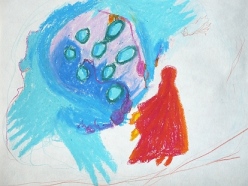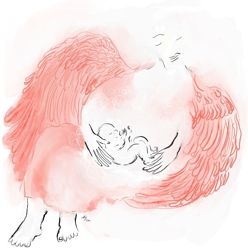 Vorhin begann ich mit dem Malen. Ich überlegte, wie ich es male, was ich in die Kugel hinein malen könnte, was darin sein könnte. Ich könnte ein kleines Kind in seine Hände hinein malen. In den weißen Ball. Ein kleines Baby. Ja, ein kleines Baby könnte darin sein. Der rosafarbenen Engel behütet das Kind.