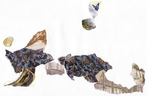 In einem anderen Traumfragment tat ich einige Papierschnipsel aus dem Buch in den schwarzen Abfalleimer unter meinem Schreibtisch. In den Apfeleimer. Es waren drei eher dunkle Papierschnipsel, nicht herausgeschnitten sondern irgendwo herausgerissen, so wie ich sie für die Collagen verwende. Ich warf sie weg. Doch da sah ich, daß auf dem letzten der drei Schnipsel, er war ganz schwarz, eine gelbe Butterblumenblüte aus dem Papier gewachsen ist.