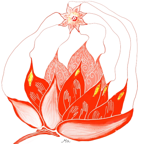 Der Gärtner, das denke ich stets beim Anblick des Gemäldes. Das Geäst des Granatapfelbaumes auf dem Goldgrund ist voller Vögel. Er blüht - und gleichzeitig reifen die Früchte an seinen Zweigen. Er blüht orangerote Federn. Er blüht Vögel. Vogelknospen. Herzvögel. Eine rosafarbene Rose rankt über dem Weidenzaun.