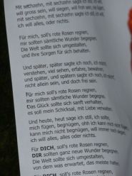 Von einem Papierschnipsel mit einer voll erblühten Blüte einer roten Rose darauf abgebildet, vor der ein Buddha meditierte. Die Statue eines Buddhas. Die Blüte war riesig und der Buddha, ich sah ihn von hinten, seinen Rücken, wie er vor dieser erblühten Rose im Lotussitz saß, im Gegensatz dazu winzig klein. Er meditierte vor einer Rose, vor der Rose, der Einen. Die vielleicht von Kinderhand hingebungsvoll aus einem Gartenkatalog ausgeschnitten oder ausgerissen wurde, um sie dann mit viel Uhu auf ein Malpapier zu kleben.