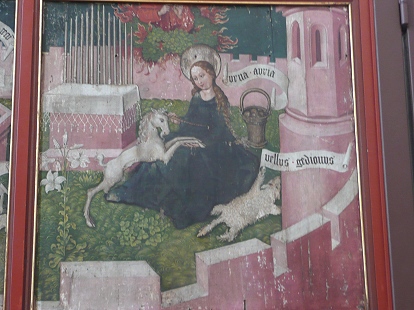 Die mystische Jagd. Das kleine weiße Einhorn hat der Jungfrau in dem blauen Kleid die Spitze seines Hornes in ihr Herz gestoßen. Ein Tropfen Blut quillt heraus.