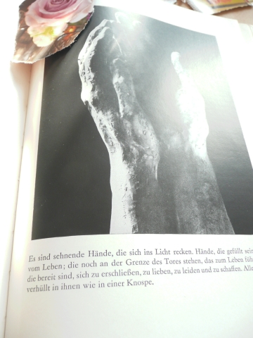 Manchmal sind die Effekte, welche das Licht gerade auf die Dinge - hier auf das Papier - malt, ganz erstaunlich. Zum Beispiel das Licht oben an den Fingerspitzen und die Strahlen schräg herab, so als gehörte es dorthin, so als sei es auch in Wirklichkeit auf der Abbildung in dem Buch vorhanden. (An der Grenze des Tores: Frauenhände von Georg Kolbe; aus dem Buch Hände als Symbol und Gestalt)