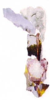 Dieses innere Bild bezieht sich auf eine Meditation bei dem Seminar über den Isenheimer Altar im letzten Frühjahr in Colmar. Die Gruppe traf sich am Abend in ihrem Hotelzimmer. Das war auf eine Weise sehr intim und heimelig. Auf dem Tischen in der Mitte lagen das Aufnahmegerät und einige Süßigkeiten. Wir im Kreis auf Stühlen und auf dem Bett. Es war das erste mal für mich, in einer Gemeinschaft und in Gegenwart einer Lehrerin zu meditieren. Das Bild bedeutet, daß sich zwei Lichtsäulen wie aus einem glitzernden Fluidum rechts und links des Menschen bilden. Herabkommen. Obwohl das Wort “herabkommen” vielleicht nicht ganz treffend dafür ist. Vielleicht eher Segen. Ja, Segen. Diese Säulen kommen also herab und der Mensch wird dadurch licht, gereinigt, schmilzt, und kann Dankbarkeit entwickeln. Die Dankbarkeit gleicht einer kelchförmigen, einer blütenförmigen, einer gelb flutenden Welle mit tausend Sternen, die sich voller Fülle wieder ins Außen ergießt, die er dann wieder nach außen abgibt.