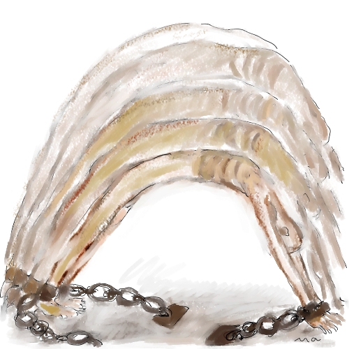 Es war noch ein Traumbild von den Gebeugten der Erde. Die Gebeugten der Erde, das ist ein Begriff aus anderen, früheren Traumbildern. Es sind Menschen, nackte Menschen, manche von Hunger gezeichnet, arm, abgemagert, gefesselt, etwas Schweres schleppend, in unendlichem Gram versunken, um Hilfe flehend. Diesmal zeigte das Traumbild nackte Menschen, welche mit dicken Ketten an Händen und an Füßen an die Erde festgekettet waren, so daß sie in gebeugter Haltung sein mußten und sich nicht aufrichten konnten. Über dem ersten, untersten, Menschen war dann der zweite an die Erde festgekettet, darüber ein dritter, und so weiter, so daß der Unterste noch das Gewicht aller anderen tragen mußte. Ein schlimmes Bild.