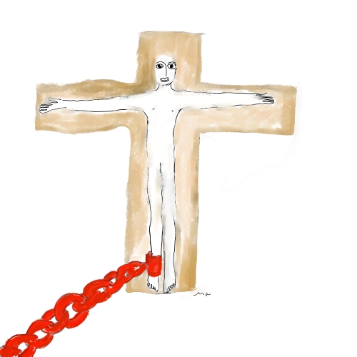 Ein inneres Bild: Jemand am Kreuz, der zudem noch mit einer dicken roten Kette um sein Fußgelenk an etwas festgekettet war.