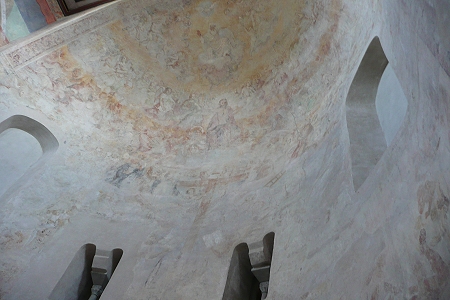 Das beeindruckende jüngste Gericht in der St. Georgskirche zu Reichenau-Oberzell über dem Eingangsbereich an der Rückwand der Kirche. Auf den Wänden rechts und links nach vorne die acht Wunder Jesu. Sie wurde von 888 bis 913 von Abt Hatto erbaut.