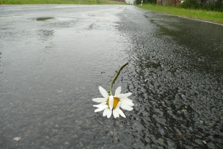 Auf der Heimfahrt, kurz vor meinem Ziel, es regnete, lag diese Blume mitten auf der Straße vor mir und ich hielt.