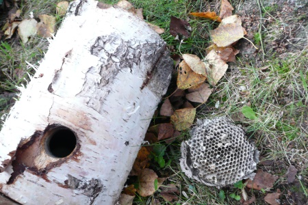 Am Bach. Wieder ist ein Vogelhaus heruntergefallen. Von der Birke. Als ich es öffnete sah ich, daß Wilde Bienen ihr Nest hinein gebaut hatten. Es war kreisrund und bestand aus unzähligen sechseckigen Wabenräumen.