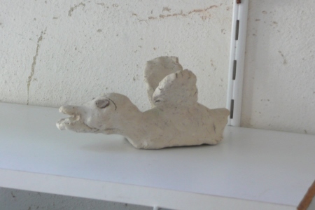 Ich war auf Schloß Oberschwappach und habe die Kunstausstellung angesehen. Das Foto zeigt eine lustige “Trophäe” von Ruthard Fella. Sie hing im Raum 3 über einer Sitzgruppe neben dem Ofen.