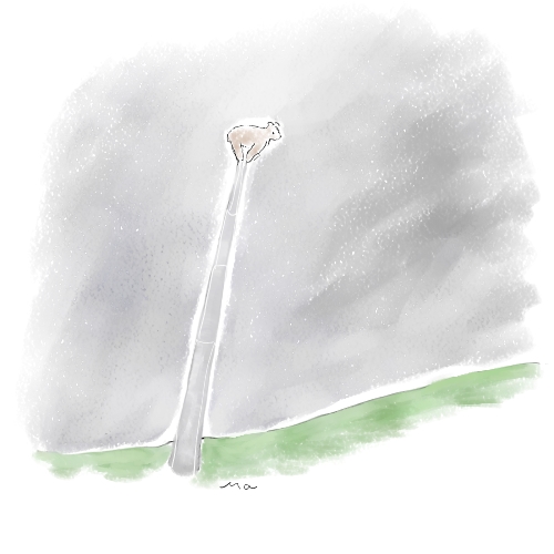 Ein Traumbild: Der Bär auf einem hohen silbernen Antennenmast in einer weiten Landschaft, die nach rechts leicht anstieg.