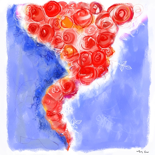 Ein Traumbild von einem gerahmten Plakat. Es hing am Eck vor der alten Schule. Ein Strudel aus Rosen vor hellblauem Hintergrund, der herabkam. Lauter rote Rosen.