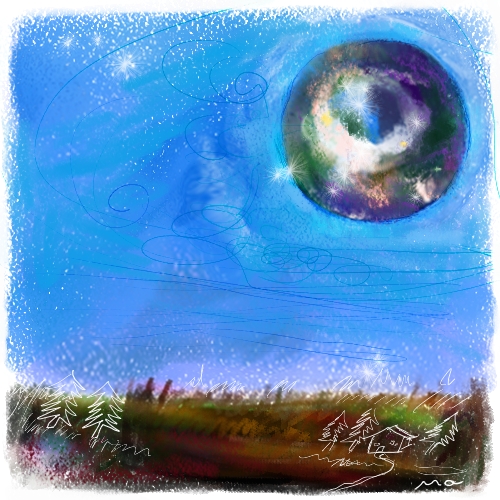 Das Bild bedeutet: Ein Flugobjekt, ein kugelförmiges Raumschiff, von rechts kommend am blauen Himmel. Perlmuttartig grün schillernd war es. Wunderschön. Blau. Violett.