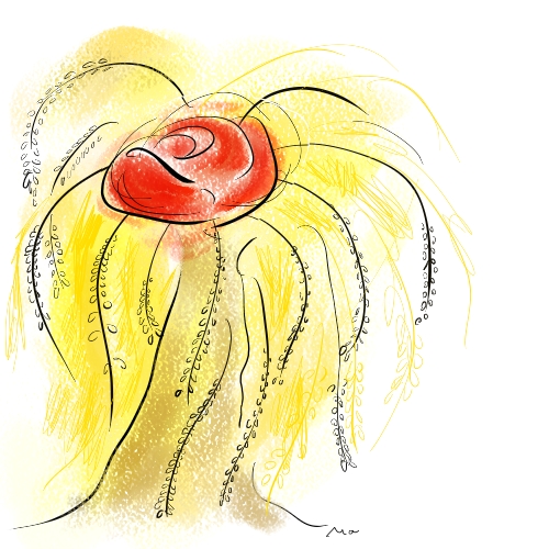 Eine rote Rose blüht aus dem Wipfel des Weidenbaums, der goldgelb leuchtet. - Es wird wahr.