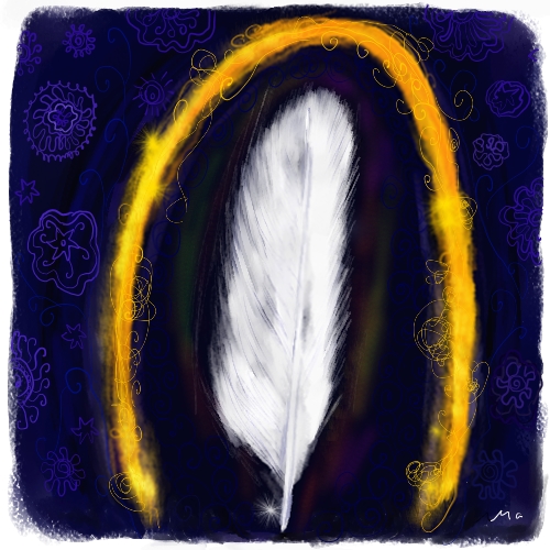 Eine weiße Feder in einem orangefarbenen Lichtneonbogen