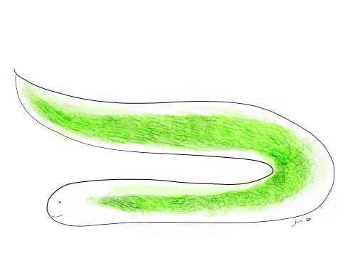 Ich habe von einer Schlange geträumt, die mir überallhin folgte, wo ich ging. Sie war recht groß und hellgrün und hatte einen weißen Bauch. Sie schien auch gerade erst etwas gefressen zu haben, denn in ihrer Mitte war sie viel dicker als an ihren beiden Enden. Sie folgte mir ins Haus, die Treppe hinauf in den Dachboden und wieder hinab. Manchmal fütterte ich sie sogar. Und manchmal schlief sie eingerollt, dann schloß ich einmal schnell die Türe um sie wegzusperren. Mir war es unanganehm, daß sie mir stets folgte, wollte sie eigentlich eher loshaben, da es ja eine Schlange war. “Uh, jetzt ist sie schon wieder da!”, dachte ich oft, wenn ich sie wieder hinter mir her kriechen sah.