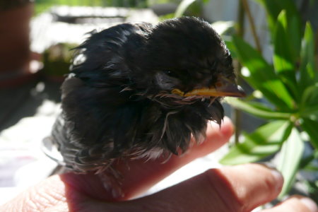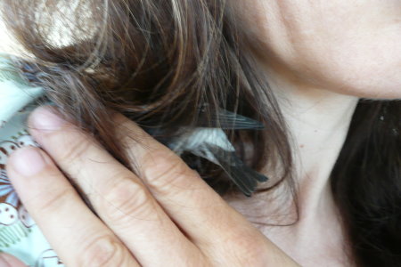 Seit heute Vormittag habe ich wieder einen Pflegling, eine kleine Schwalbe. Es ist kaum zu glauben, daß die ersten jungen Schwalben jetzt schon wieder flügge sind. Das Pflaster an der Hauswand ist immer noch voller kleiner Eierschalen. Ich fand sie im Hof. Sie kann noch nicht richtig fliegen, schafft gerade einmal hundert, zweihundert Meter. Auch sonst wirkt sie recht schwach. Sie mag gerne Nähe und Wärme und versteckt sich oft im Haar.