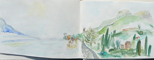 Jeden Tag, zur Zeit des Abendessens, begannen sich erst die Berge des gegenüberliegenden Ufers ganz langsam blau zu verfärben, sie nahmen die Farbe des Sees an. Der an manchen Abenden glatt wie ein Speigel war. So unschuldlig. Und plötzlich, in der Nacht, verwandelte er sich wieder in ein tosendes und Gischt spritzendes Meer.