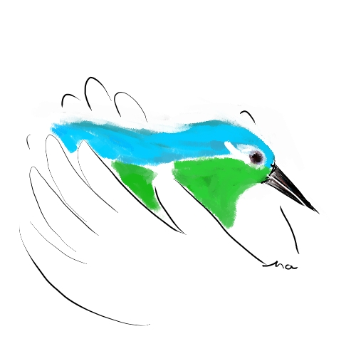 Hier am Bach haben wir viele Schwalben, seit heuer wieder ein Amselpaar, Blaumeisen, Kohlmeisen, Spatzen, Erlenzeisige, Stiglitze, Klaiber, die grazile Bachstelze, Zaunkönige. Heute rief ein Kuckuck. Ein Entenpaar. Ein Falkenpaar, welches, fliegt es über das Haus, oft gellend schreit. Tauben. Manchmal, in den frühen Morgen- oder Abendstunden, schaut auch der Reiher vorbei.