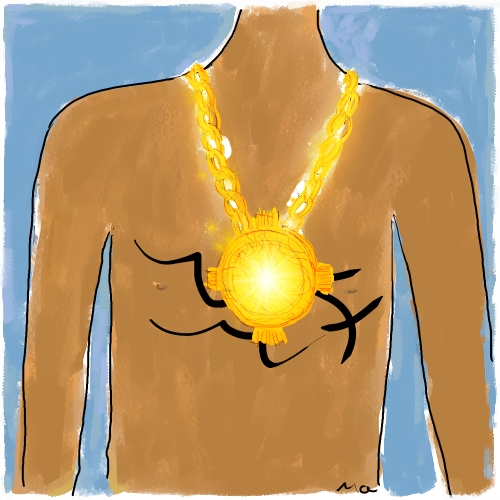 Jemand zeigt sein neues Kleid. Nur der Oberkörper, aber kein Gesicht. Er ist tätowiert. Und er trägt eine goldene Kette um den Hals mit einem großen goldenen Siegel mitten auf der nackten Brust, aus dem plötzlich mehr und mehr gleisendes magnetisches Licht bricht, immer heller scheinen die Strahlen, schließlich ist es blendend weiß. Der Mann ist verschwunden und das Siegel ist wie zu einem riesigen Tor geworden. Das Licht erfaßt einen und zieht einen in sich hinein. Man geht vollkommen darin auf.