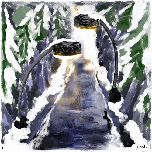 Auf der breiten Straße: Auf einmal werden die Straßenlampen, es sind schwarze Autoreifen, eingeschaltet und es wird hell. Sie werden plötzlich zu ovalen, goldenen Lichteiern