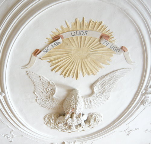 Detail der Stuckdecke der kleinen Kapelle: Sequenzen des Guten Hirten, in der Mitte der Pelikan, der seine drei Jungen nährt.