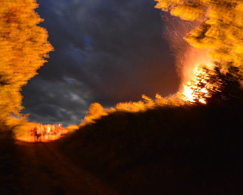 Das riesige Feuer erhellte mit seinem lodernden Schein die Vollmondnacht. Ab und zu öffneten sich die Wolken in seltsamen Mustern und Formen und gaben den Blick auf einen Himmel frei, der köngisblau leuchtete. Das ganze Dorf schien auf den Beinen. Bekannte gingen grüßend vorbei. Den Hohlweg hinauf, die Zweige der Büsche und Bäume links und rechts über uns fast geschlossen, einander berührend, als ginge man durch ein unendlich langes Kirchenschiff, angenehme Kühle, an manchen Stellen des Weges lockten duftend im Dunkel verborgen Holunder, Minze und andere unsichtbare Blüten von Kräutern, Büschen, Gräsern und Bäumen.